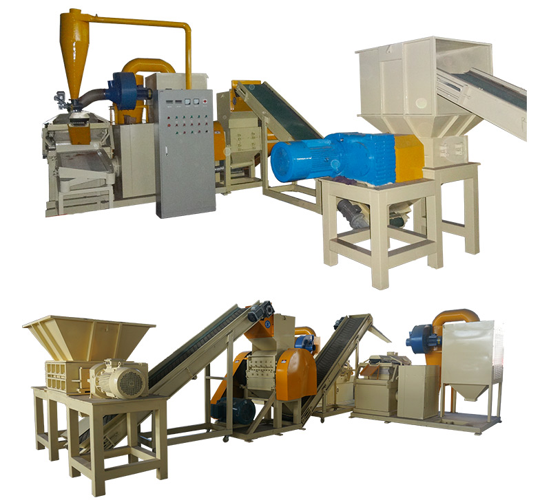 The material is put into the first-stage crusher through the feeding conveyor for primary pulverization, and the disordered waste cable is roughly cut into smaller sizes.The second belt conveyor is fed into the secondary crusher (pulverizer), and the material is crushed into a certain size in the second crusher (final discharge size).Mixed plastic skin chips and copper rice enter the airflow sorting system via high pressure blower or conveyor belt.Clean copper and plastic skin fragments are sent from different discharge ports by air flow and vibrating screen vibration. The equipment is equipped with a small vibrating screen to separate the material twice to achieve a purity of not less than 99%.